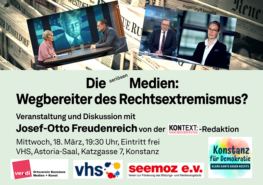 Darüber informiert und diskutiert am Mittwoch, 18. März 2026, der Journalist Josef-Otto Freudenreich von der Wochenzeitung kontext. Im Astoria-Saal der VHS Konstanz. Beginn: 19:30 Uhr. Der Eintritt ist frei.