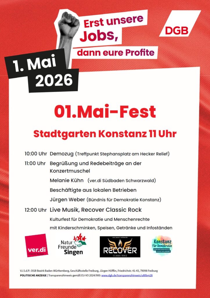 In Konstanz beginnt die Feier um 10 Uhr mit einer Demo (Treffpunkt: Stephansplatz), danach versammeln wir uns im Stadtgarten. Themen dieses Jahr u.a.: Der Kampf für die Demokratie und gegen die extreme Rechte, Hilfe für Flüchtlinge; die Auseinandersetzung in den regionalen Betrieben.